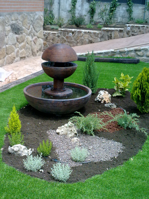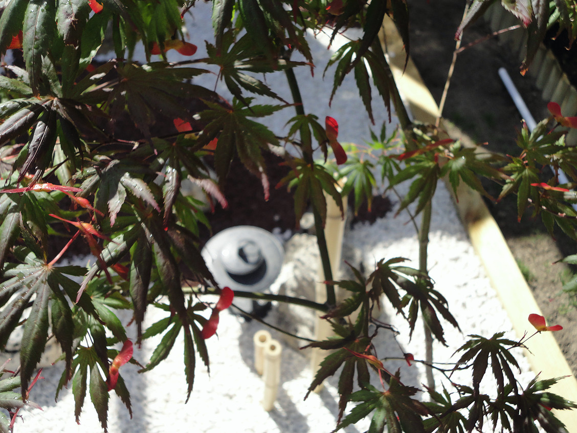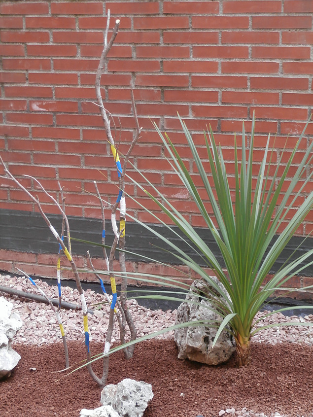 Creación de una entrada oriental en espacio reducido. Los cinco elementos conviven en una esquina, dando un bonito motivo para entrar en la vivienda.